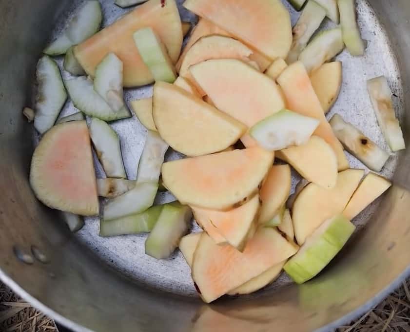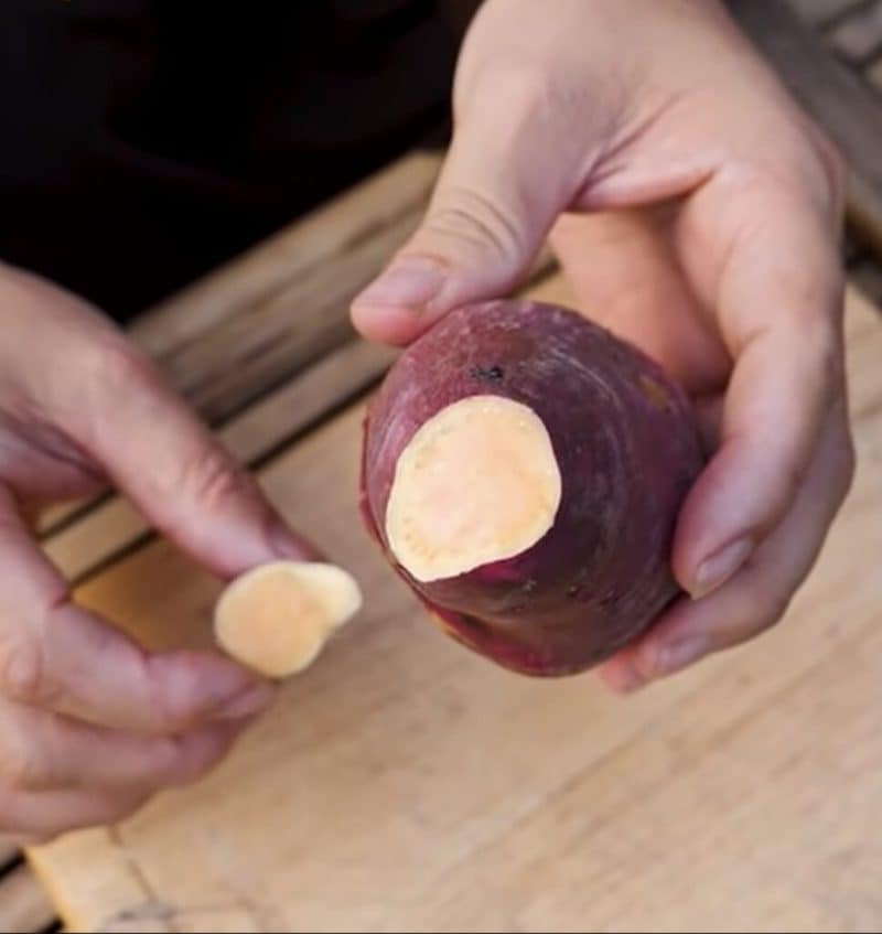 - Sơ chế: Với khoai lang, bạn cạo vỏ, rửa sạch, cắt thành từng lát dày khoảng 1 cm. Với quả bầu, bạn gọt vỏ, rửa sạch, lấy phần thịt quả rồi cũng cắt thành từng lát dày 1 cm.
